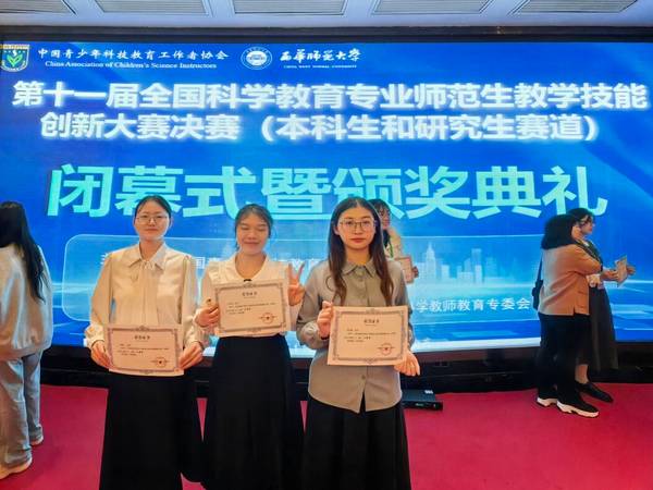 12月1日至3日,由中国青少年科技教育工作者协会主办,西华师范大学承办的第十一届全国科学教育专业师范生教学技能创新大赛决赛(本科和研究生赛道)在西华师范大学华凤校区举行。太阳集团tcy8722胡蓉、姜心懿、李卓群等3名选手在决赛中敢打敢拼,最终取得了3项三等奖的成绩。