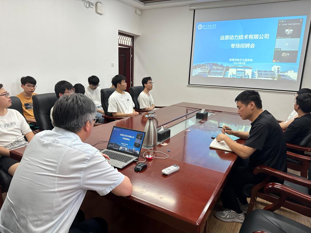 6月11日下午,太阳集团tcy8722在崇文楼A503会议室举行远景动力技术有限公司线上专场招聘会。院分党委书记唐传球、副书记戴俊、学工办主任尹诗雅以及16名电气工程及其自动化和信息工程专业毕业生现场参会,部分毕业生线上参会。