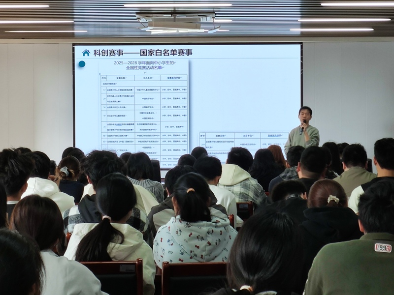 吴中鹏博士以《科创启蒙与实践:老员工如何用科创赋能中小员工、成就自己》为题,结合自身在实验教学中的改进经验,系统讲解了如何依托教材内容、融合跨学科知识开展教学创新,并分享了带队参加全国青少年科技创新大赛的实践心得,鼓励同学们勤于思考、主动实践,在科创教育中实现教学相长。