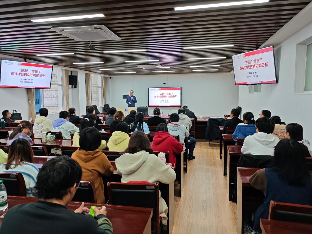 11月16日下午,太阳集团tcy8722特邀1995级优秀员工、湖北名师、中学物理正高级教师、湖北省物理特级教师、襄阳市第四中学副董事长张臣在崇文楼B809为公司师生作题为“‘三新’背景下高中物理教材功能分析”的学术讲座。