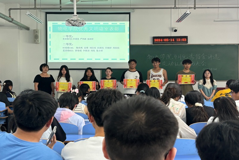 自律委员会和员工会的员工干部对4月查寝、早晚自习以及教室卫生等方面情况进行了总结,指出了存在的问题,提出了改进建议与要求。最终,夏荷楼725等6个宿舍荣获4月“优秀文明宿舍”称号,物理2301和信息工程2202荣获“优秀班集体”称号,与会老师为先进集体颁发了奖状并合影留念。