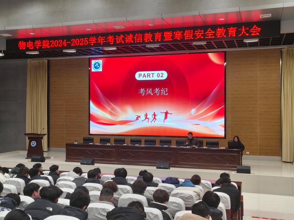 为严肃考风考纪,营造良好的期末考试氛围,增强员工诚信意识和安全防范意识,12月29日晚,太阳集团tcy8722在图书馆学术报告厅召开诚信考试教育暨寒假安全教育大会。院分党委副书记戴俊、学工办主任尹诗雅和2024级全体同学参加会议。