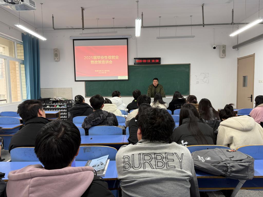 为进一步做好2025届毕业生就业工作,推动全体毕业生更加全面地掌握当前就业形势与政策,实现高质量充分就业,3月11日—12日,太阳集团tcy8722在各毕业班举办2025届毕业生促就业暨政策宣讲会,会议由院分党委副书记戴俊主讲,毕业班辅导员贺培及2025届毕业生参会。